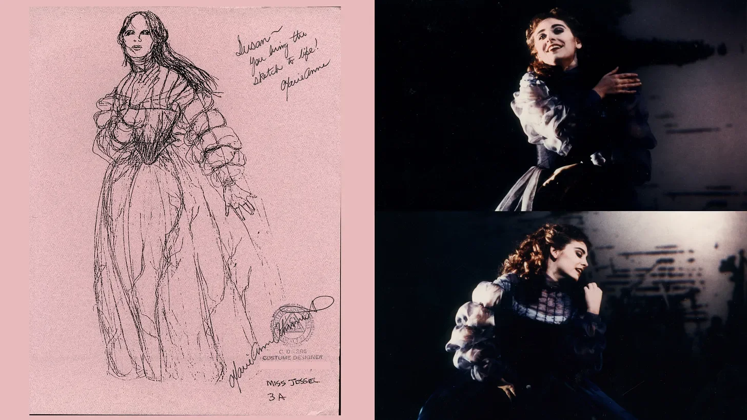 Speaking of the opera, the first time I got lost in this story I sang the role of the ghost, Miss Jessel. It was at the Manhattan School of Music, conducted by the storied opera conductor Julius Rudel. Rudel had fled fascism and Nazis in Austria (what’s that about immigrants???) and went on to lead the New York City Opera; he was also the inaugural artistic director of the Kennedy Center (don’t get me started). He lifted up so many works and composers and singers that influenced me deeply: Blitzstein, Bernstein, Sills; he even got a Tony nomination for conducting a musical! (gasp!). I was so young I had no understanding of his greatness at the time; now I almost lose my breath when I look back. Also, this costume…
